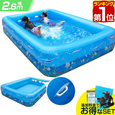 1年保証 プール 大型 2.6m ハンドル 付き ビニールプール ファミリープール 幅 260cm x 奥行き 170cm x 高さ 50cm 庭 ベランダ 除菌剤 消毒 電動ポンプ 空気入れ バタ足 練習 スイミング 水泳 水あそび キッズプール 家庭用プール 子供用プール ★[送料無料]