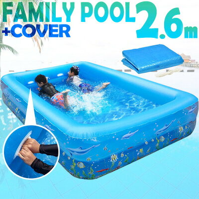 1年保証 プール 大型 2.6m ハンドル & プールカバー 付き ビニールプール ファミリープール 幅 260cm x 奥行き 170cm x 高さ 50cm 庭 ベランダ 除菌剤 消毒 電動ポンプ 空気入れ バタ足 練習 スイミング 水泳 水あそび キッズ 家庭用プール 子供用プール ●[送料無料]